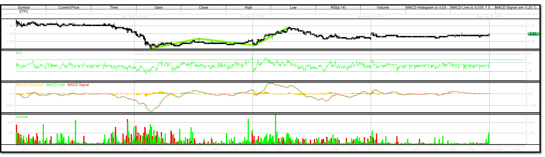 A small trade has developed in ETFC. The trade on the one minute trading time frame is a little late to enter, but you could get a pullback. The technical levels are well defined in this trading time frame. The chart below is the 1 minute. Notice how ETFC traded to a low of 1.68 on September 24, 2009, traded to a high of 1.78, then tested the low before moving higher early on the following day of trading. Using a wave one magnitude of .09 cents, ETFC traded within .01 cents of its wave 3 calculated Elliott wave level of 1.89 on September 25, 2009. Currently we have tested the wave four Elliott wave level of 1.81 reaching 1.77 and closing at 1.82 today September 28, 2009. This 1 minute wave sequence can go lower to the 1.72 level but 1.71 is your sell stop. The possible trade in the one minute trading time frame would be to the Elliott wave five level of 2.01.