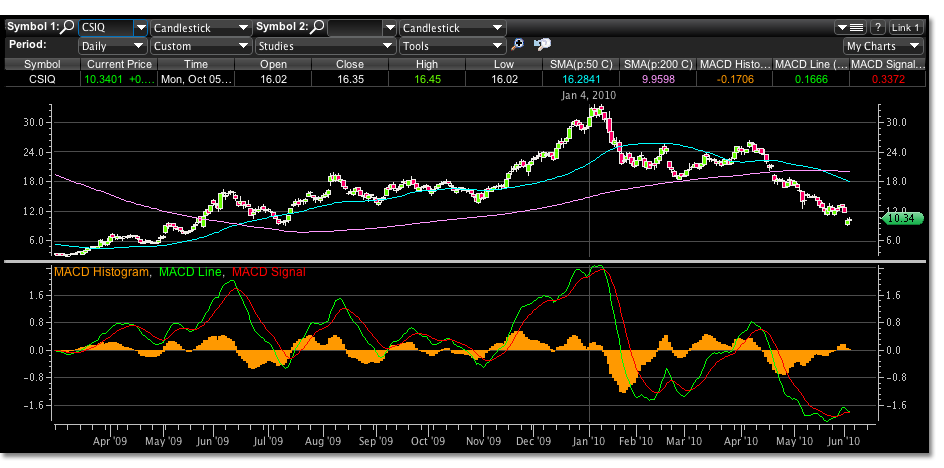 According to JPMorgan news flows yesterday June 2, 2010-“Canadian Solar (CSIQ) price target cut at Barclays to $11 from $22 as the company is under SEC investigation, delaying 1Q10 results. Maintain Equal Weight Rating.” This is reason to respect the price sell stop, understanding that unforeseen events may alter projections. This is also likely part of the reason for the extended sell off, along with a large short interest at the moment. However, this is exactly the sentiment that creates potential buying opportunities.
