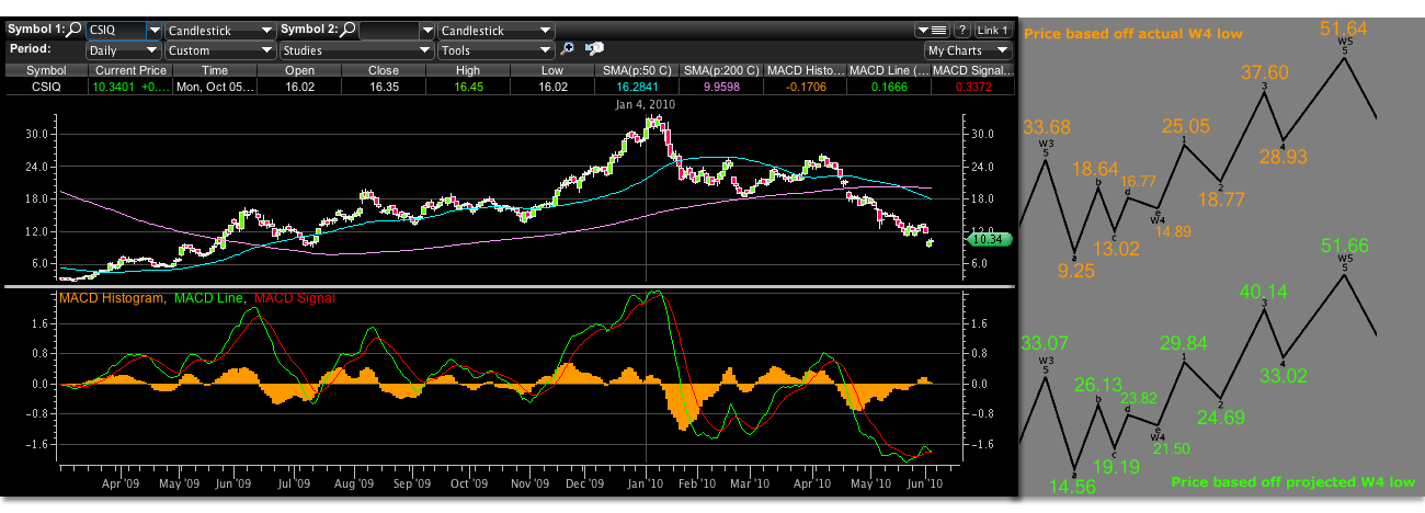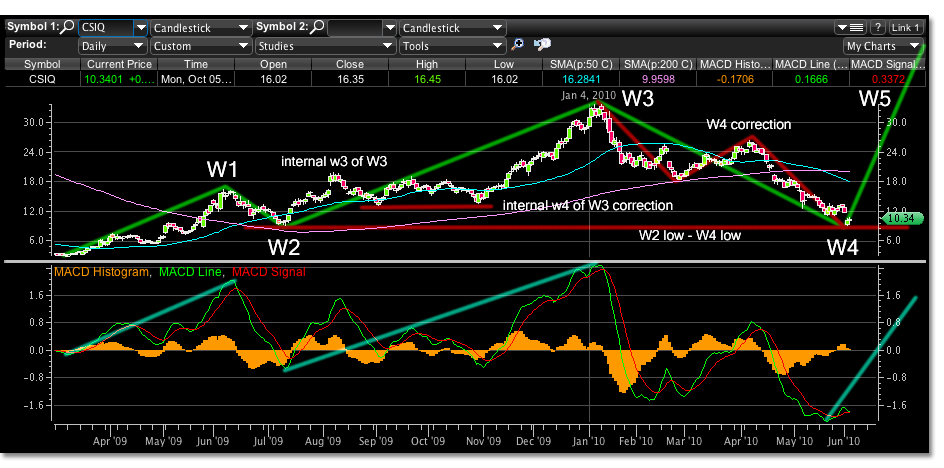 Since we have calculated that the 16.45 price level was indeed the wave 1, the wave following this high was the 9.21 price low on 07/13/09 that we mentioned previously and becomes wave 2 low. So far CSIQ has kissed that price almost literally, trading to 9.25, and this sets up a very simple entry point and sell stop for a possible large move higher.