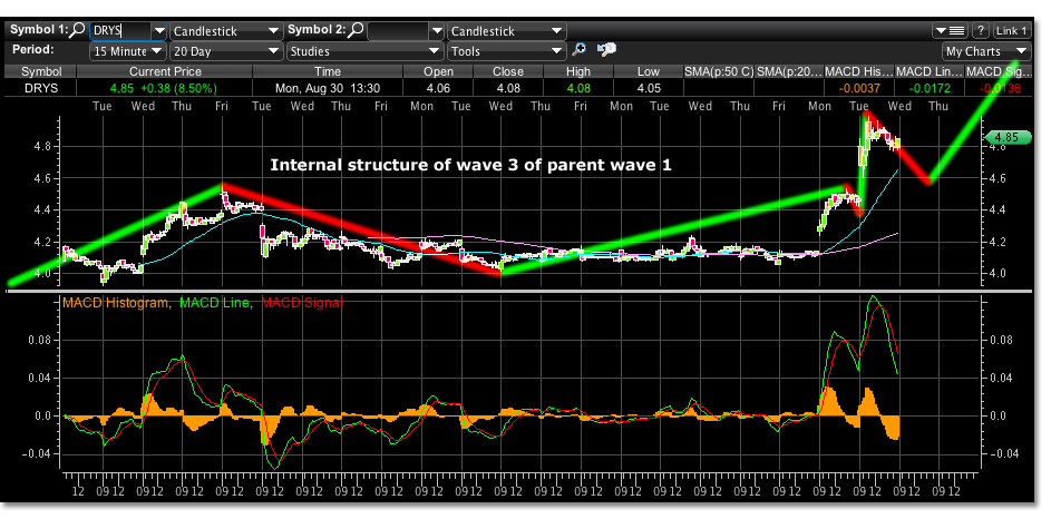 We wont revisit longer term predictions and analysis, but instead lets see if DRYS can complete some bullish wave sequences near term. It certainly has so far as the diagrams below will show, but it has not completed a parent wave since 11.48 high, and even if that was a bullish parent wave, it would have been a rare irregular wave 2.