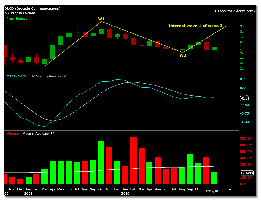 In December of 2009 a trading signal was issued on BRCD which was to take advantage of the short uptrend of the B wave of an ABC correction. The initial profit level was met for a gain of 7%, however the longer term profit fell short by 8%.