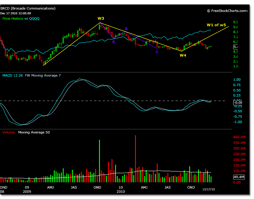 The ABC correction was projected to be complete at 5.02. BRCD traded to 4.99 on 5/21/10, but continued to drift lower trading to 4.64 on 8/24/10. The 9.84 price high is currently embedded in a triangle correction, making it a wave 3.