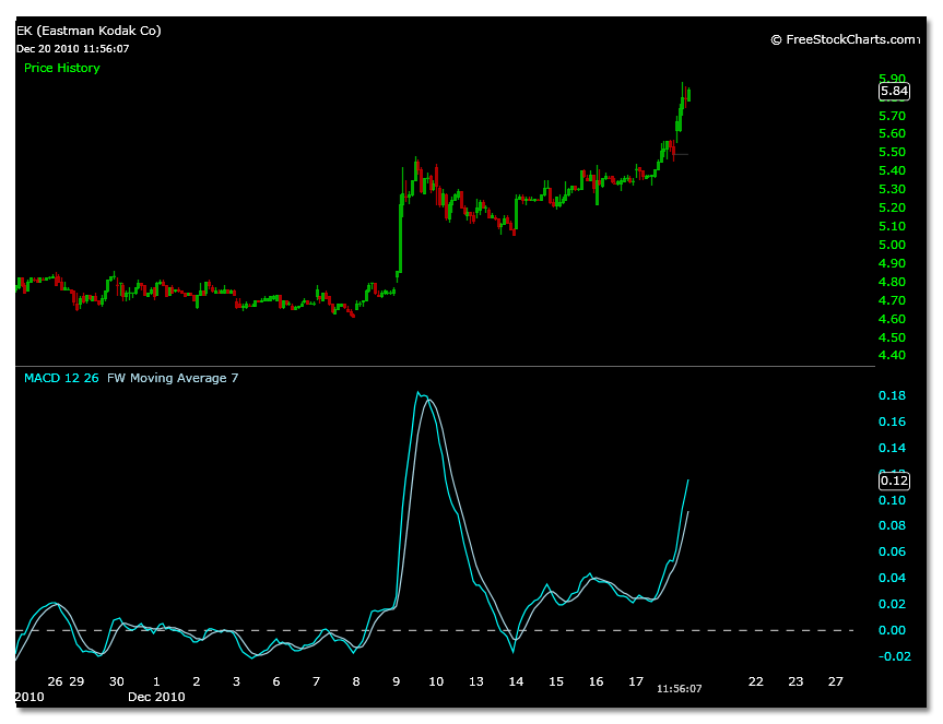 If using the actual A wave low in this scenario of 3.49, traded 8/31/10, and the wave B projected price target of 7.44, a projected wave 3 of this 5 wave sequence comes to 5.93. EK has traded to 5.88 so far today, which is actually an internal wave 3 of three of a larger time frame.