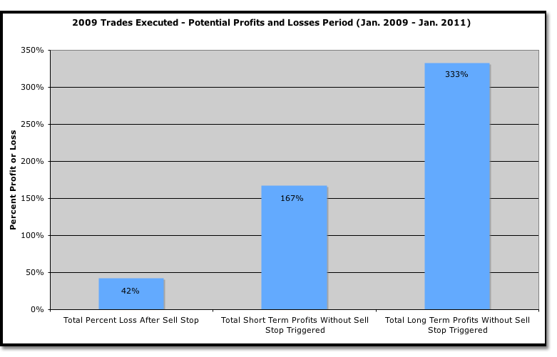 ††Disclaimer to all figures. The trade signal issued for ETFC on Monday July 22, 2009, resulting in a short term profit level met of 45% followed by a reverse split 1:10 by which the long term profit level was met, was not used in calculating potential profits or losses for any data presented above. Trade signal issued for UNH on 08/06/09, resulting in a long term profit level met of 55% after the stop loss was triggered- this long term profit was not used in calculating potential profits or losses for any data presented above because it was triggered after the sampling dates of the profits and losses analysis for 2009. Trade signal issued for SAH on 09/17/09, resulting in a long term profit level met of 45% after the stop loss was triggered- this long term profit was not used in calculating potential profits or losses for any data presented above because it was triggered after the sampling dates of the profits and losses analysis for 2009.